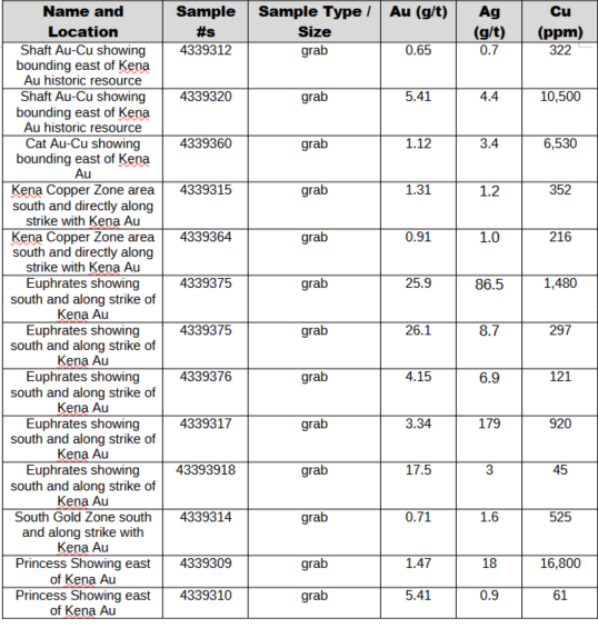 The exploration focused on several key areas, including the Lower and Upper Euphrates showings in the southern half of the property, which reported historic production and are now accessible via new logging roads. Samples from these showings averaged 8.61 g/t Au and 31.6 g/t Ag. Another promising area includes the Cat, Shaft, Dighem, and Princess showings along the east side of the main gold body, associated with strong geophysical anomalies and returning up to 1.68% Cu. The Kena Copper Zone and adjoining South Gold Zone, extending southeast from the main body, also show wide intersections of copper and gold from historic drilling, supported by new surface samples. The company believes these results point to a major gold-copper mineralized system that extends well beyond the currently defined lode gold body and remains open along strike and at depth.