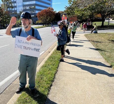 One man on Little Patuxent Parkway held up a sign: “Not a paid protester. I hate Trump for FREE.”