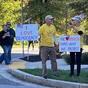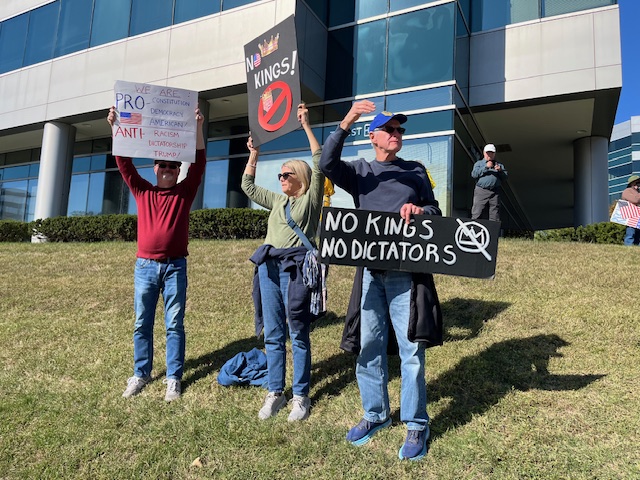 Van Hollen said: “This is not the America we want. That is not the America we fight for… I can’t tell you how heartened I am to see all of you and millions of Americans coming together today. People who love our country. People who respect the constitution…. All of you are patriots who say we are not going back to the days of King George. We do not bow down to kings. No kings.”