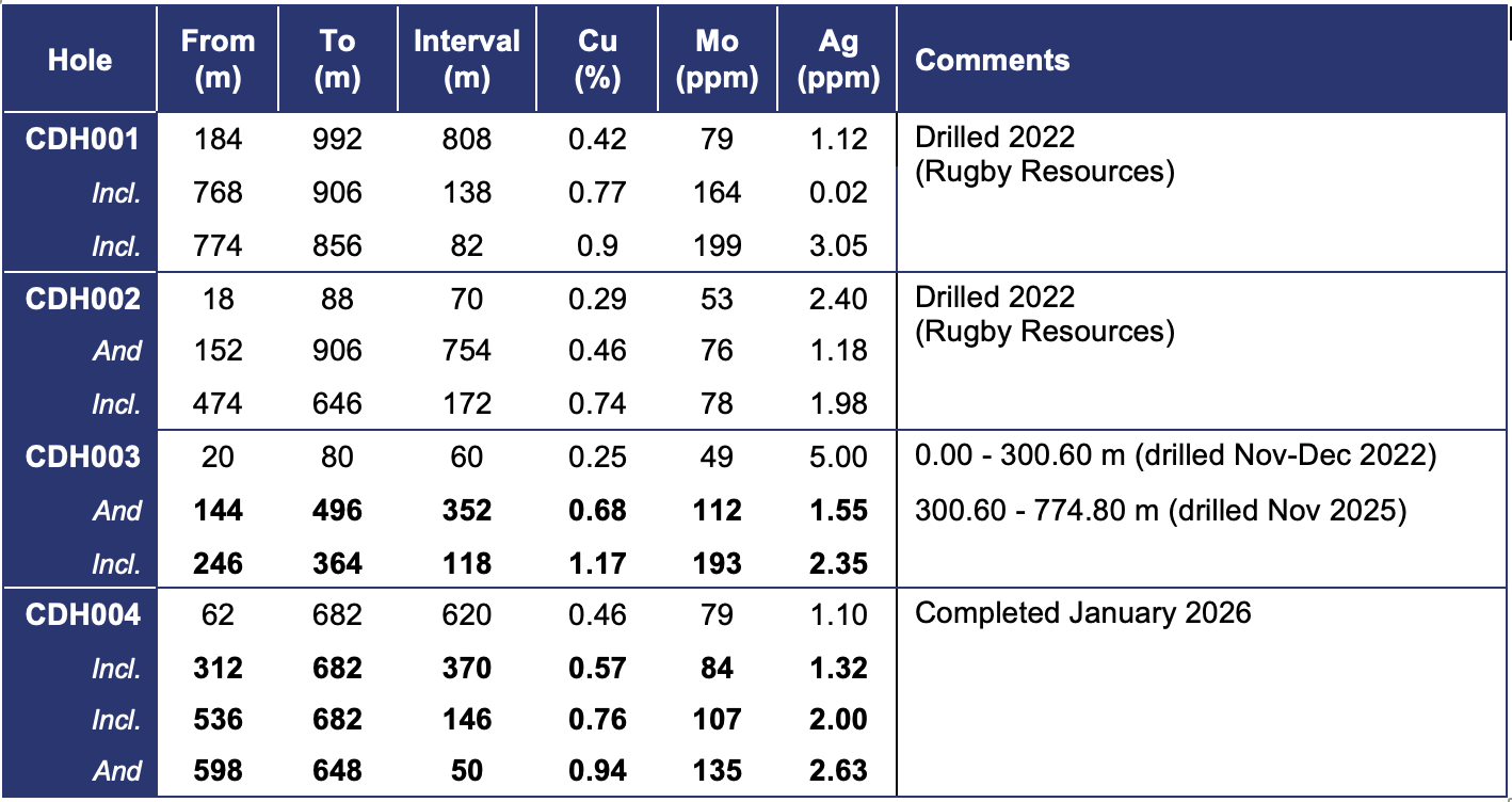 Following on from the recent high-grade copper-molybdenum intersections in drillhole CDH003 (352m @ 0.68% Cu, 112 ppm Mo; Incl. 118m @ 1.17% Cu, 193 ppm Mo (refer News Release dated 5 February 2026)), results from subsequent drillhole CDH004 have reported further intercepts of strong mineralization.