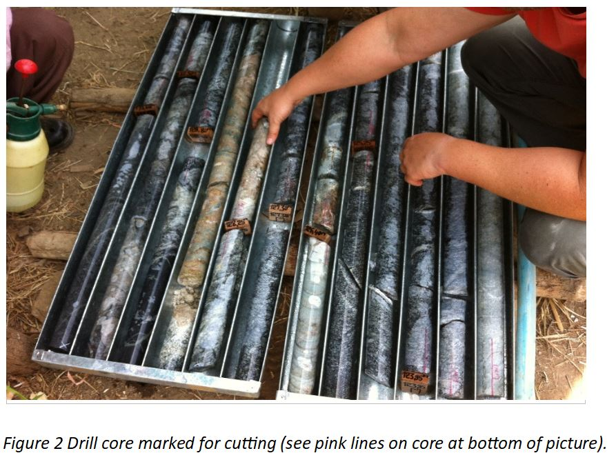 Figure 2 Drill core marked for cutting (see pink lines on core at bottom of picture).