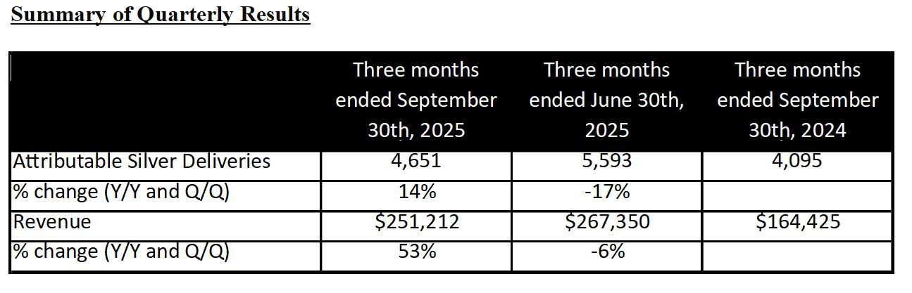 In the third quarter SCRi recorded revenue based on 4,651 silver ounces (C$251,212). This compares to the prior quarter ended June 30th, 2025 of 5,593 ounces (C$267,350) and last year’s third quarter ended September 30th, 2024 of 4,095 ounces (C$164,425).