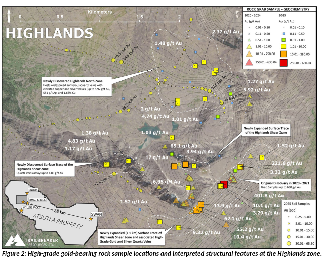 VANCOUVER, BC - January 8, 2026 (NEWMEDIAWIRE) - Trailbreaker Resources Ltd. (TBK.V) (“Trailbreaker” or “the Company”) is pleased to announce results from its 2025 exploration program at the Atsutla Gold project in northwestern British Columbia (BC). Detailed prospecting and mapping in the Highlands zone area has expanded the known footprint of high-grade gold (Au) showings and led to discovery of new high-grade copper-gold-silver (Cu-Au-Ag) showings on recently acquired claims.