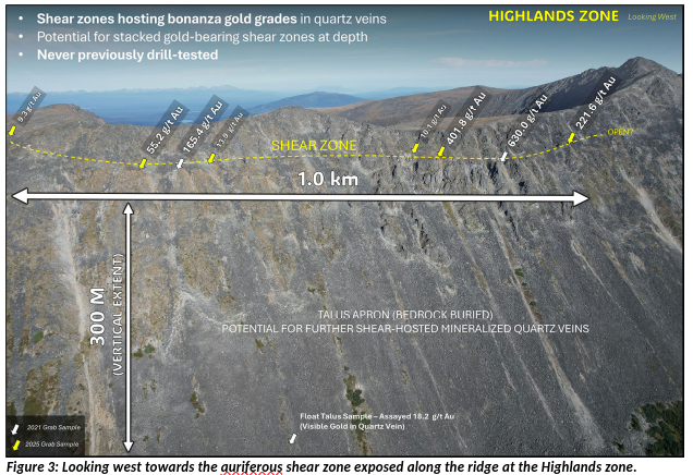 Gold at the Highlands zone is found within quartz veins ranging from 10 cm to 60 cm thick occurring within a continuous, shallow-dipping shear structure. The gold-bearing quartz veins typically host galena and arsenopyrite, but commonly have no visible sulphide minerals. During 2025, this structure was traced along the side of a ridge for 1.0 km in a NE-SW direction (Figures 2 and 3). Rock samples taken from the northeast corner returned assays up to 221.6 g/t Au, and rocks taken from the southwest corner returned assays up to 9.32 g/t Au. The highest gold value returned, 401.8 g/t Au, 493 ppm Ag (Photo 1), was obtained from a rock taken 140 m from the previously discovered high-grade showings. The structure was traced for an additional 1.2 km to the west, onto newly acquired claims, where assays returned values up to 4.83 g/t Au.