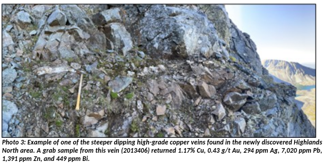 A newly discovered zone of high-grade copper, termed the Highlands North zone, yielded up to 1.65% Cu, 5.92 g/t Au, and 551 ppm Ag (from separate rocks) in an area 1.1 km north of the high-grade gold showing at the Highlands zone. The high-grade copper values were returned from more steeply dipping quartz veins from 20 cm to 80 cm thick, hosting chalcopyrite, bornite, malachite, azurite, and pyrite. Five rock samples in this area returned assay values greater than 1% Cu, and eight samples returned values greater than 100 ppm Ag (see Photo 3).