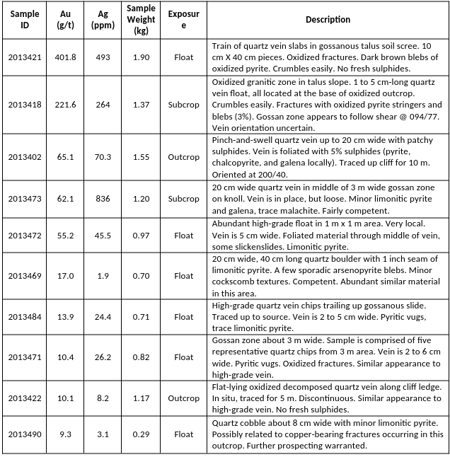 The 2025 exploration program consisted of the collection of 147 soil samples and 77 prospecting grab samples during late August and early September. Final assays were not received until late December due to multiple re-analyses of high-grade gold, copper, and silver as well as additional QA/QC completed by Bureau Veritas Labs. Table 1 (below) displays the ten highest gold values returned from these assays.