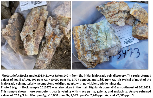 - Snook Zone - High-grade veins 3.5 km northeast of the Highlands Zone, with rock samples assaying up to 53.3 g/t.