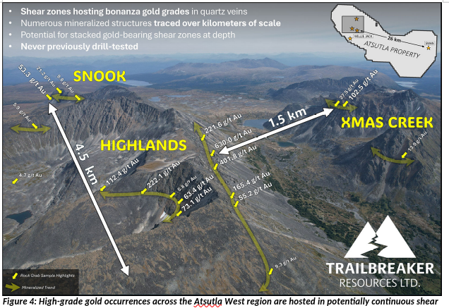 Trailbreaker’s team has interpreted the shear structure delineated at the Highlands zone to be continuous, with similar structures found at the Christmas Creek zone (1.5 km to the east), and the Snook zone (4.5 km to the north). The total surficial footprint of this area is 5.0 km x 4.3 km. Figures 1 and 4 display mineralization across the Atsutla West area. Rock sampling indicates potential for further shear-hosted mineralized quartz veins at lower elevations along the slope, however much of this area is masked by a thick talus apron (Figure 3). Further rock sampling and geological mapping is warranted to test for their presence.
