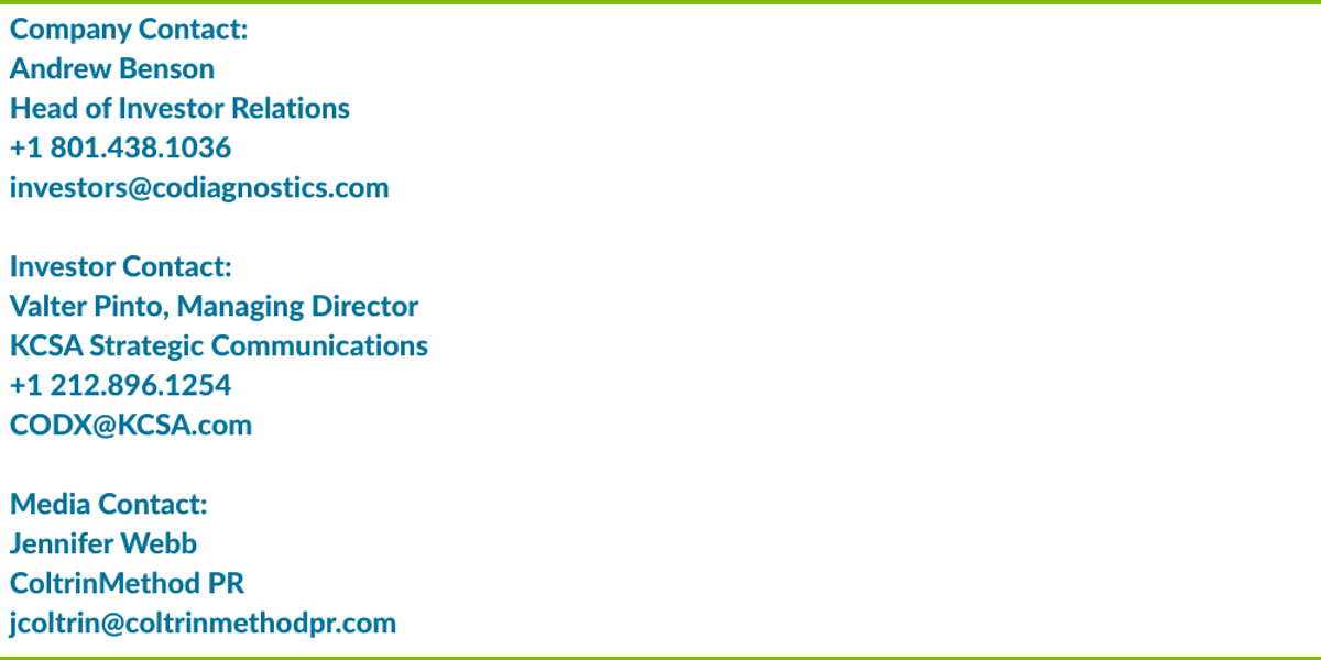 About Co-Diagnostics, Inc.:Co-Diagnostics, Inc., a Utah corporation, is a molecular diagnostics company that develops, manufactures and markets state-of-the-art diagnostics technologies. The Company’s technologies are utilized for tests that are designed to detect and/or analyze nucleic acid molecules (DNA or RNA). The Company also uses its proprietary technology to design specific tests for its Co-Dx PCR at-home and point-of-care platform (subject to regulatory review and not currently for sale) and to identify genetic markers for use in applications other than infectious disease.